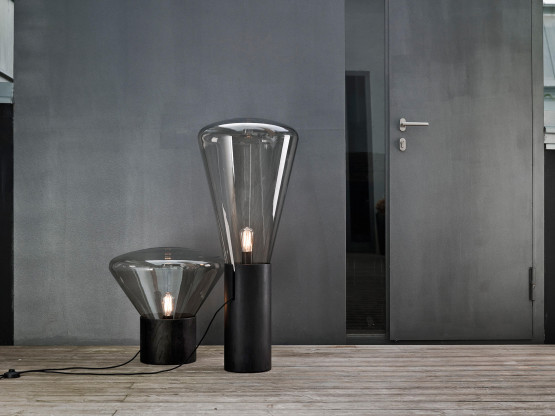 Angeboten wird die mundgeblasene Glasleuchte MUFFINS WOOD 04 Stehleuchte of milano.design