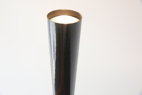 Um 360° schwenkbare und um 25° neigbare (Kugelgelenk) Stehleuchte mit Kegel aus Kohlefaser und Sockel aus schwarz lackiertem Metall.