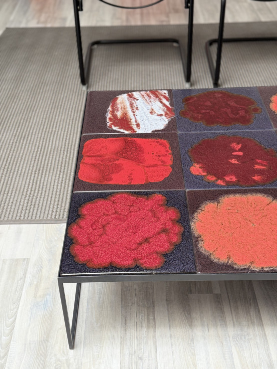 Das Deckdekor ist handgefertigt und macht jedes einzelne Stück zu einem Unikat. Das Material, der besondere Herstellungsprozess und die Technik führen zu unterschiedlichen Mustern auf jedem Element, die wiederum voneinander unterschiedliche Oberteile bilden, auch innerhalb derselben Charge. Unregelmäßigkeiten sind die charakteristischen Merkmale dieses Produktionsprozesses.