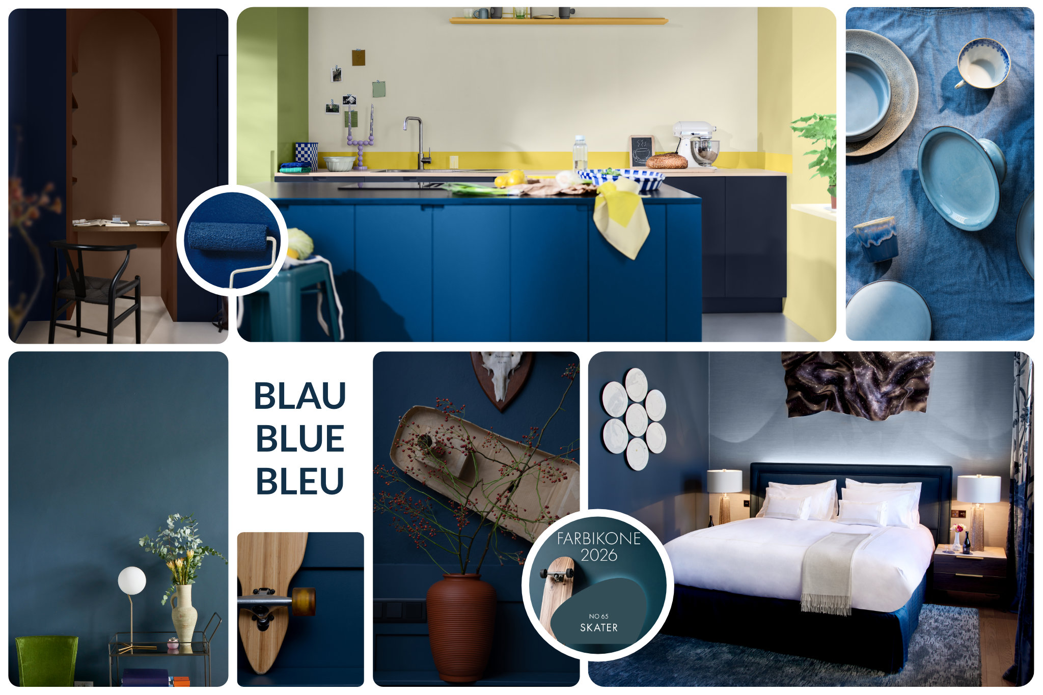 Blau setzt 2026 den Ton: Indigo und Türkisblau von Dulux und Caparol Icons verwandeln Räume in ruhige, charakterstarke Rückzugsorte.